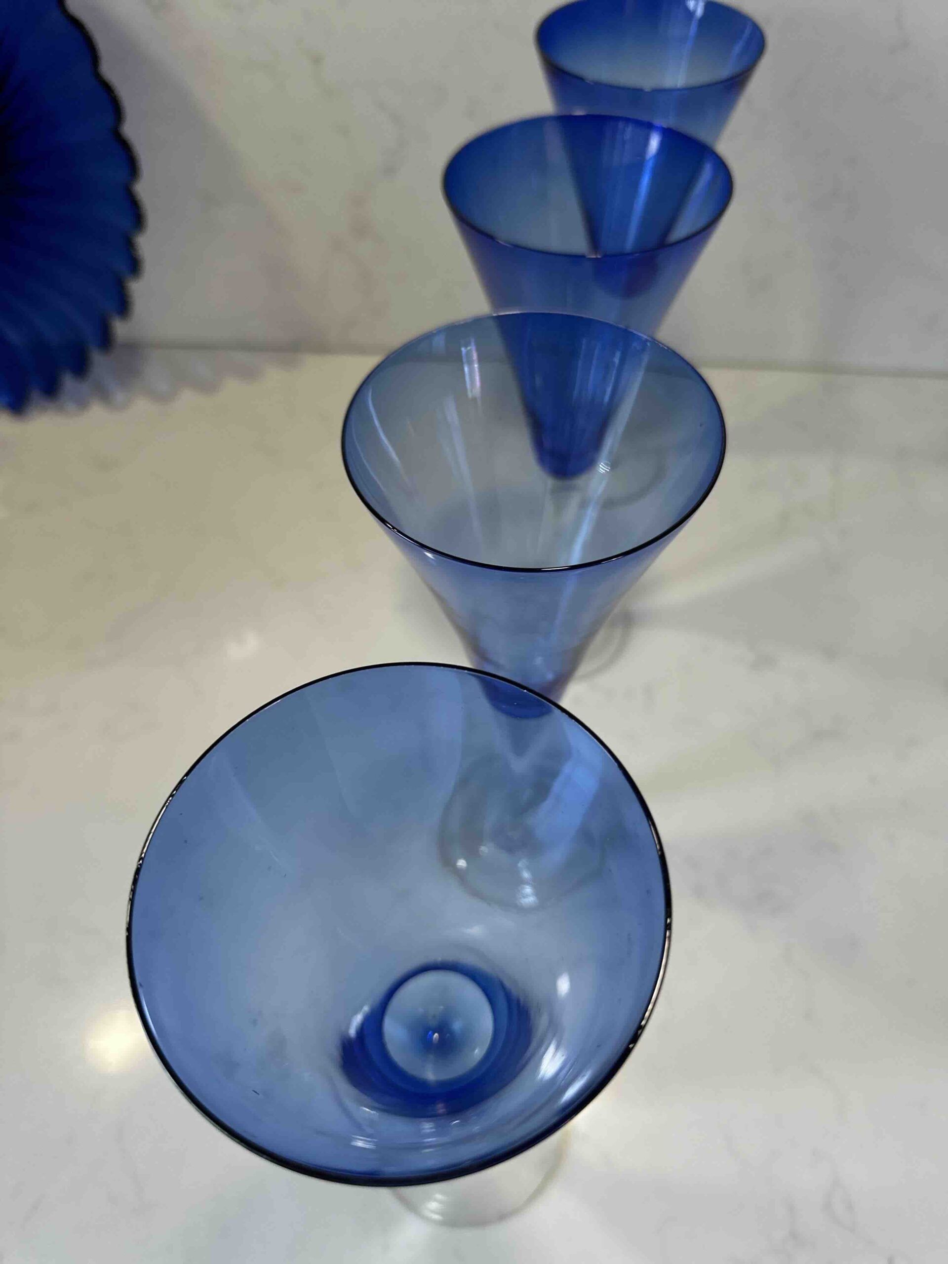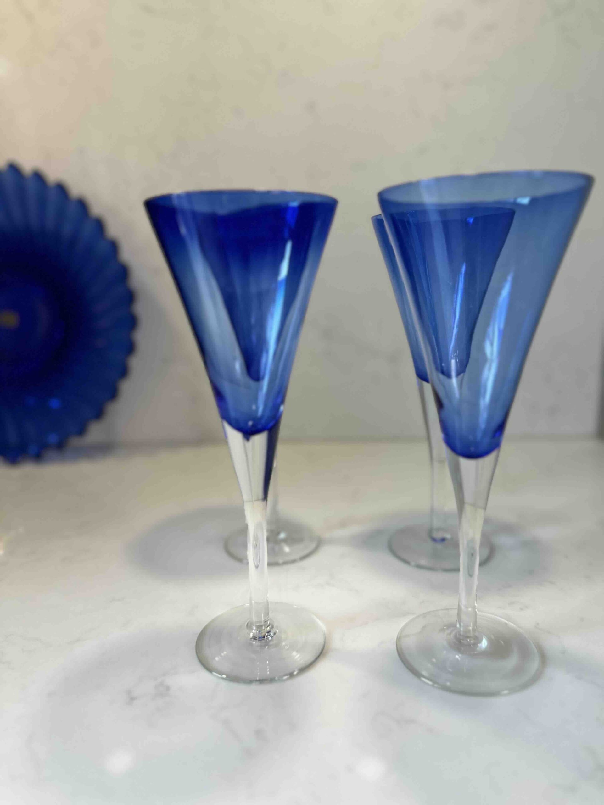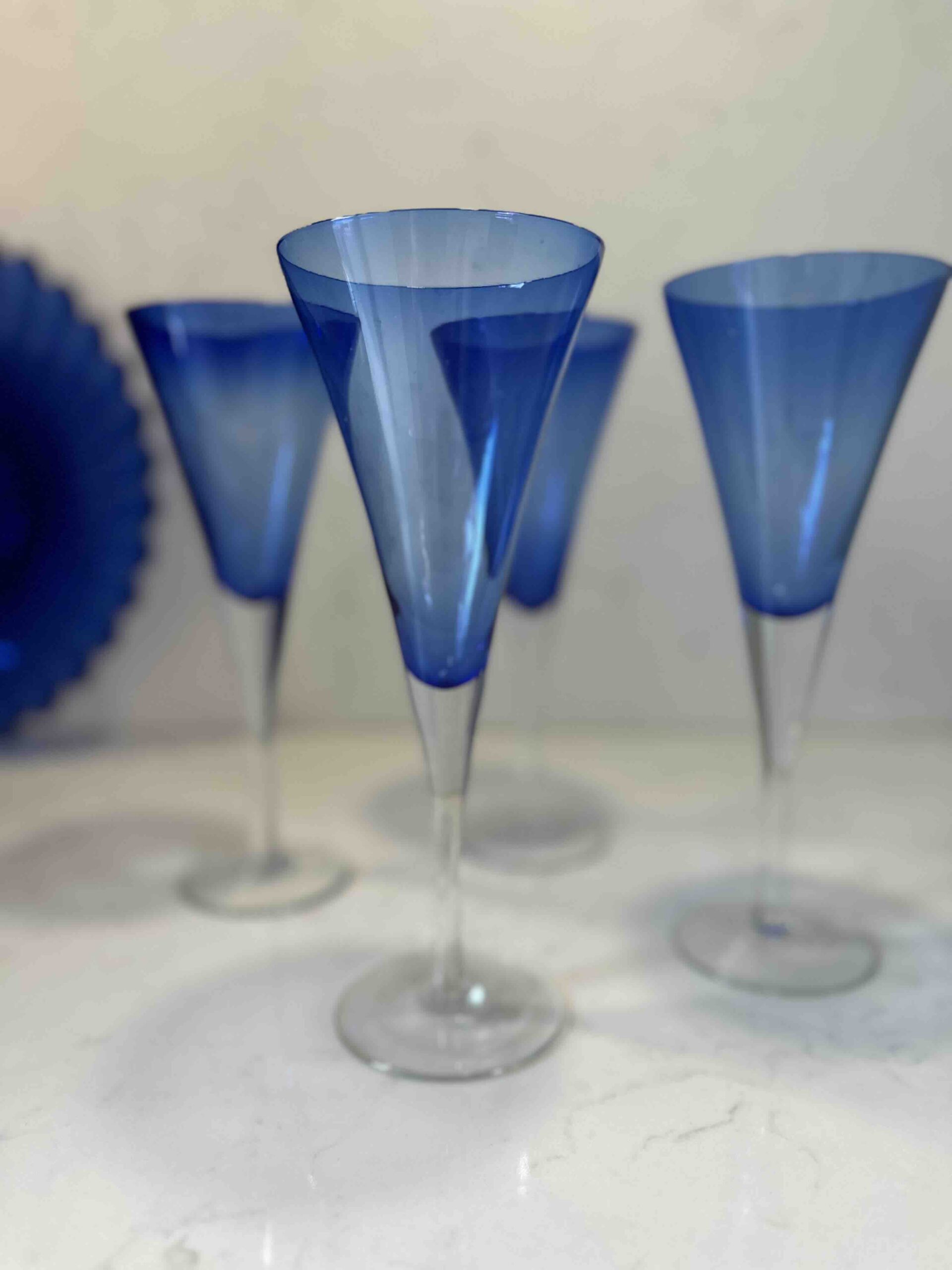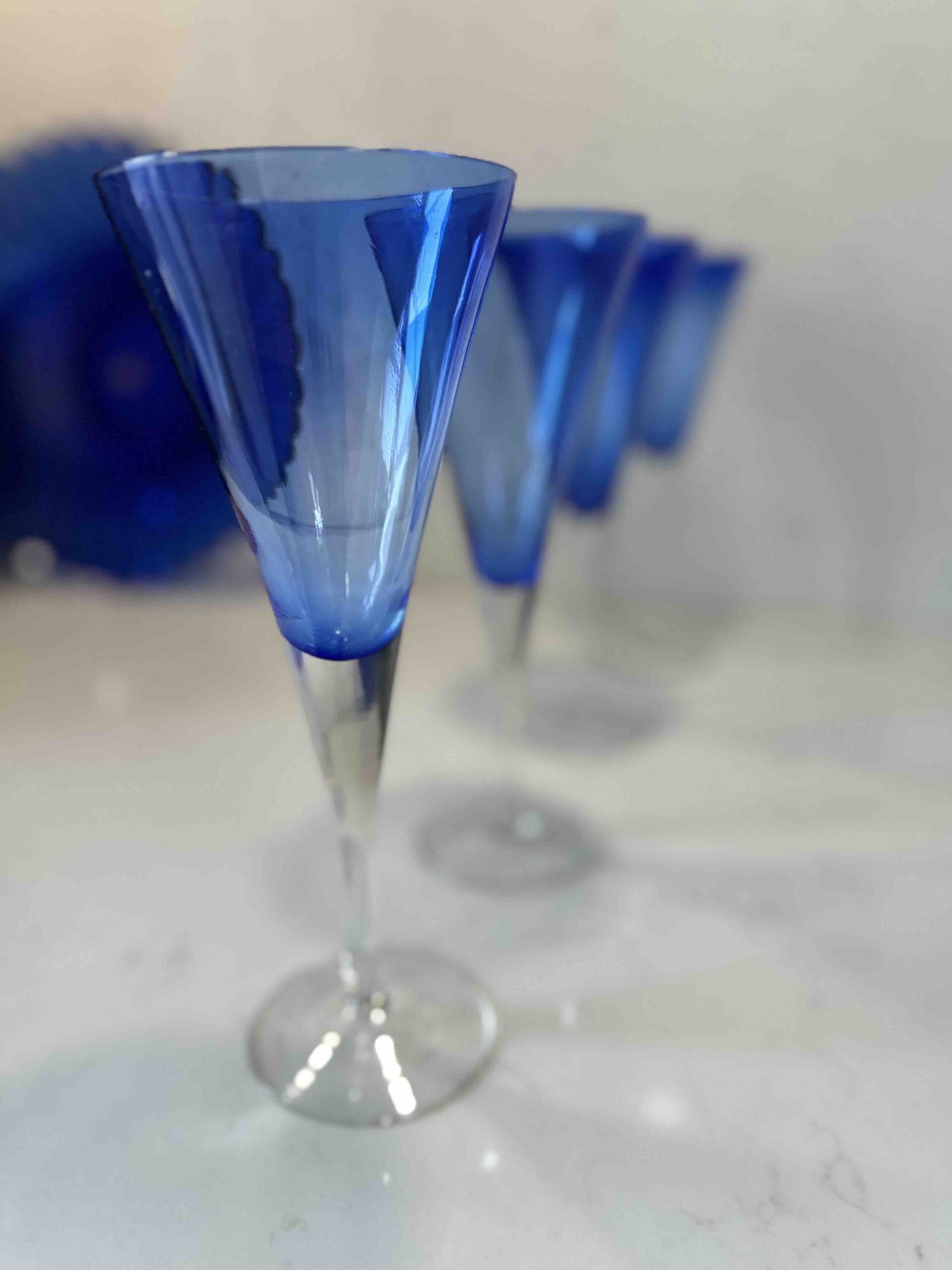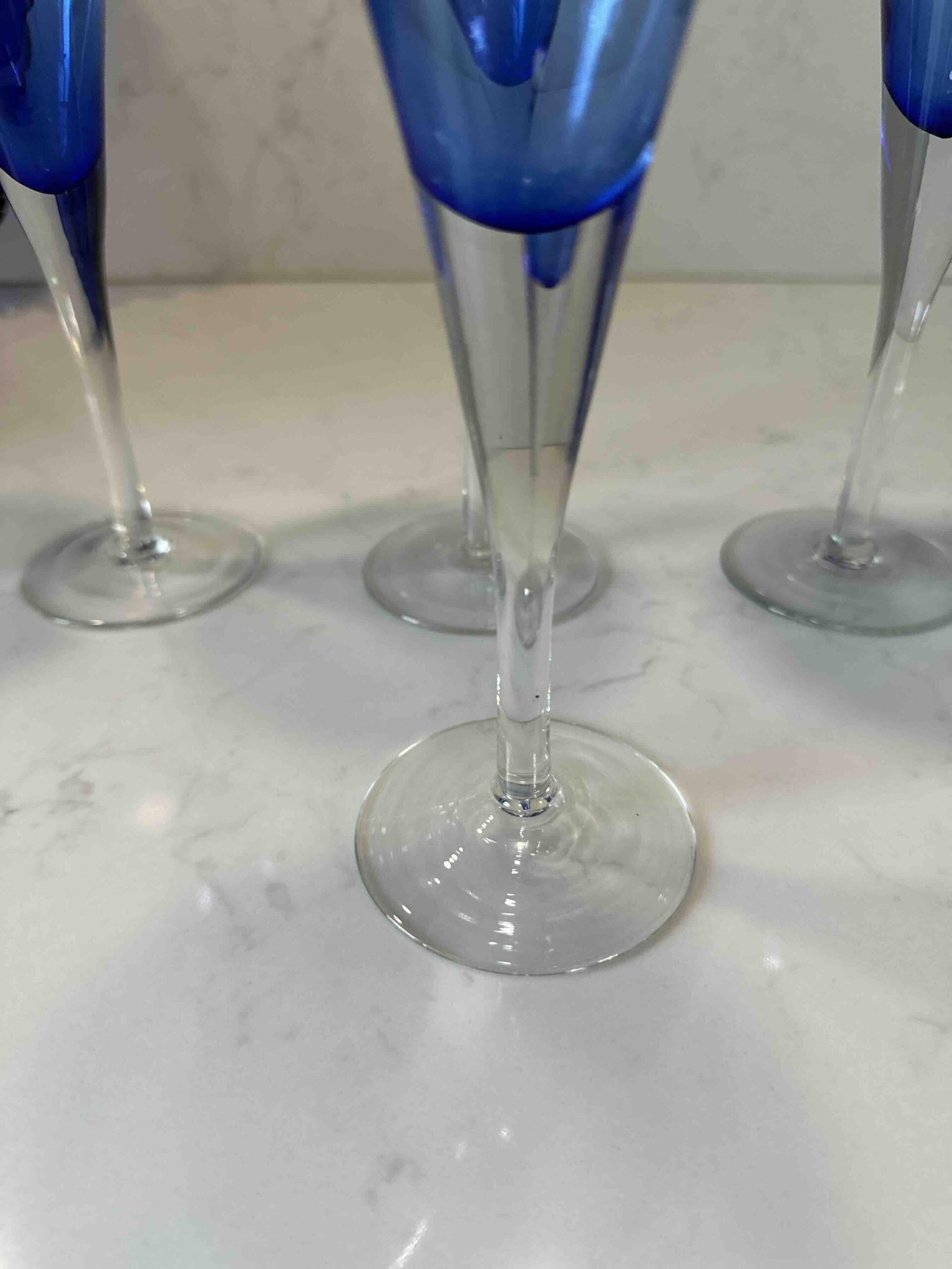 Prachtige gave champagne glazen. Mooi blauwe kelk op een blanke voet.