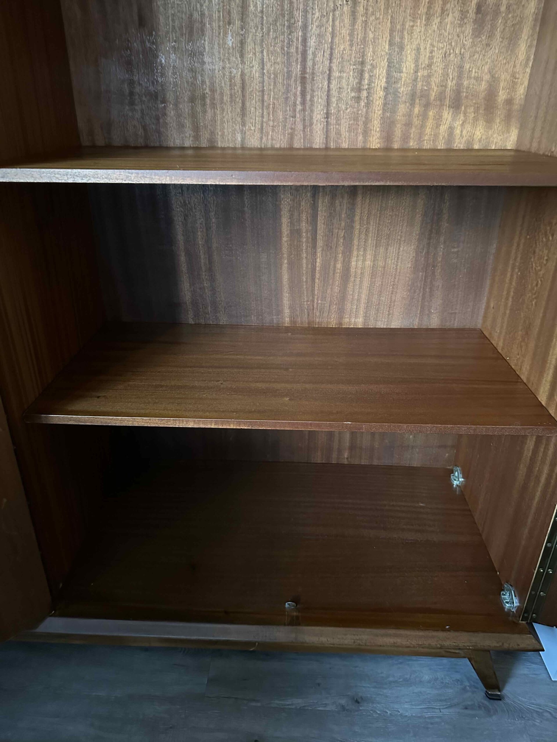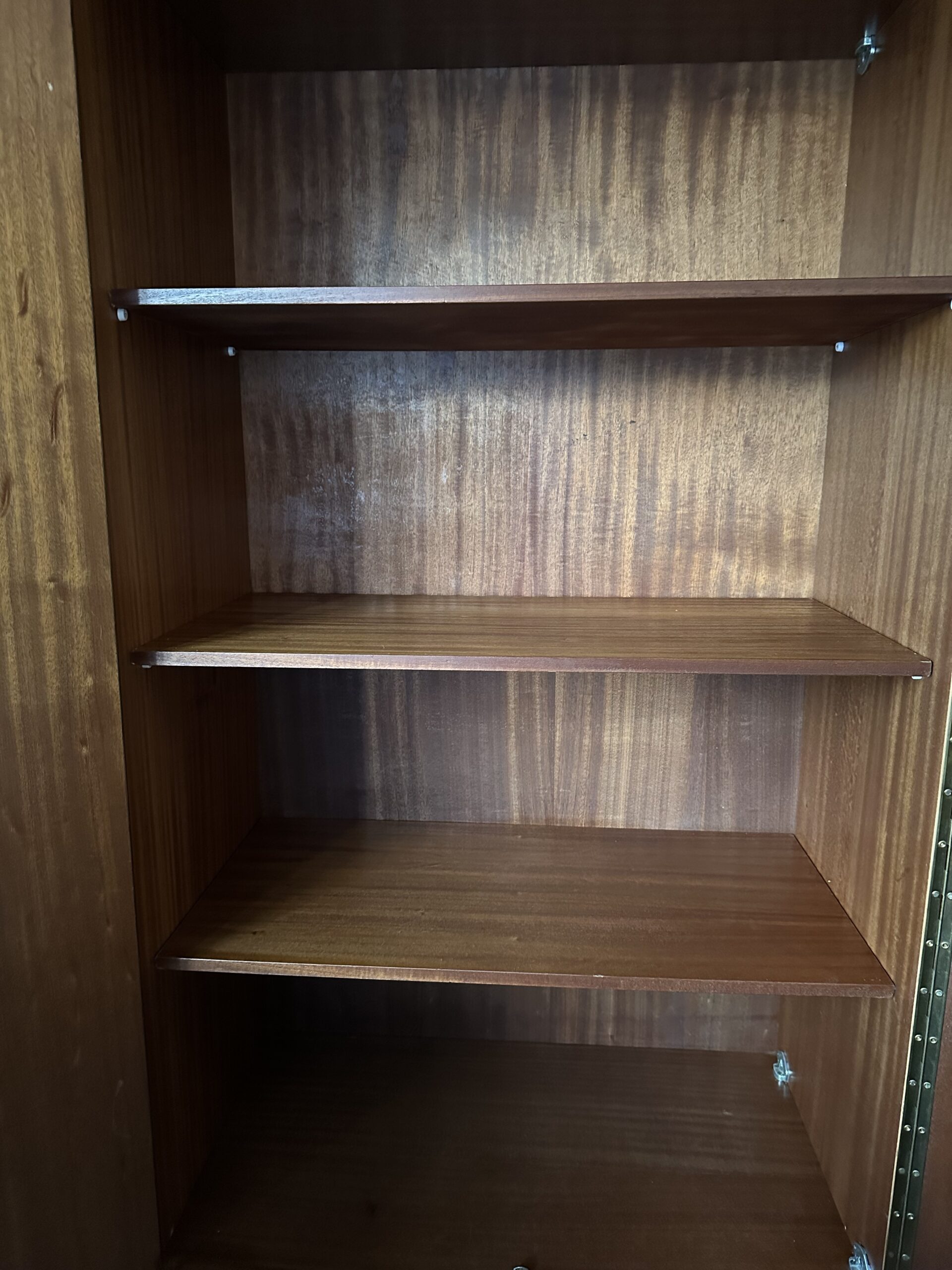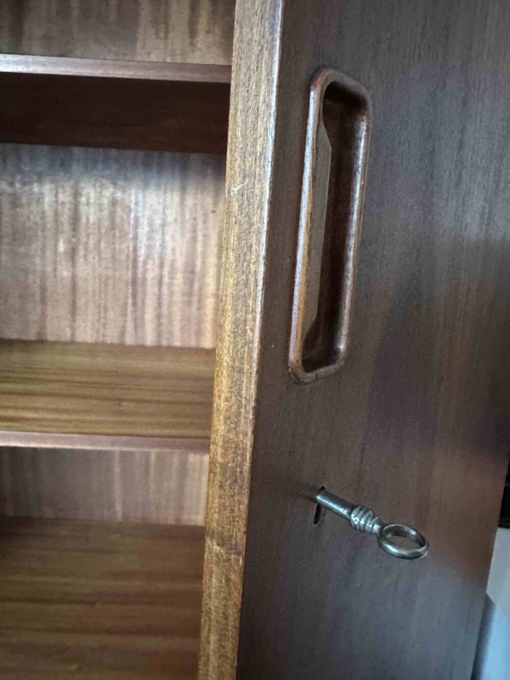 Deze prachtige vintage 3-deurs kleding-/ linnenkast van teak met hang- en leggedeelte is uit de jaren 50 – 60.