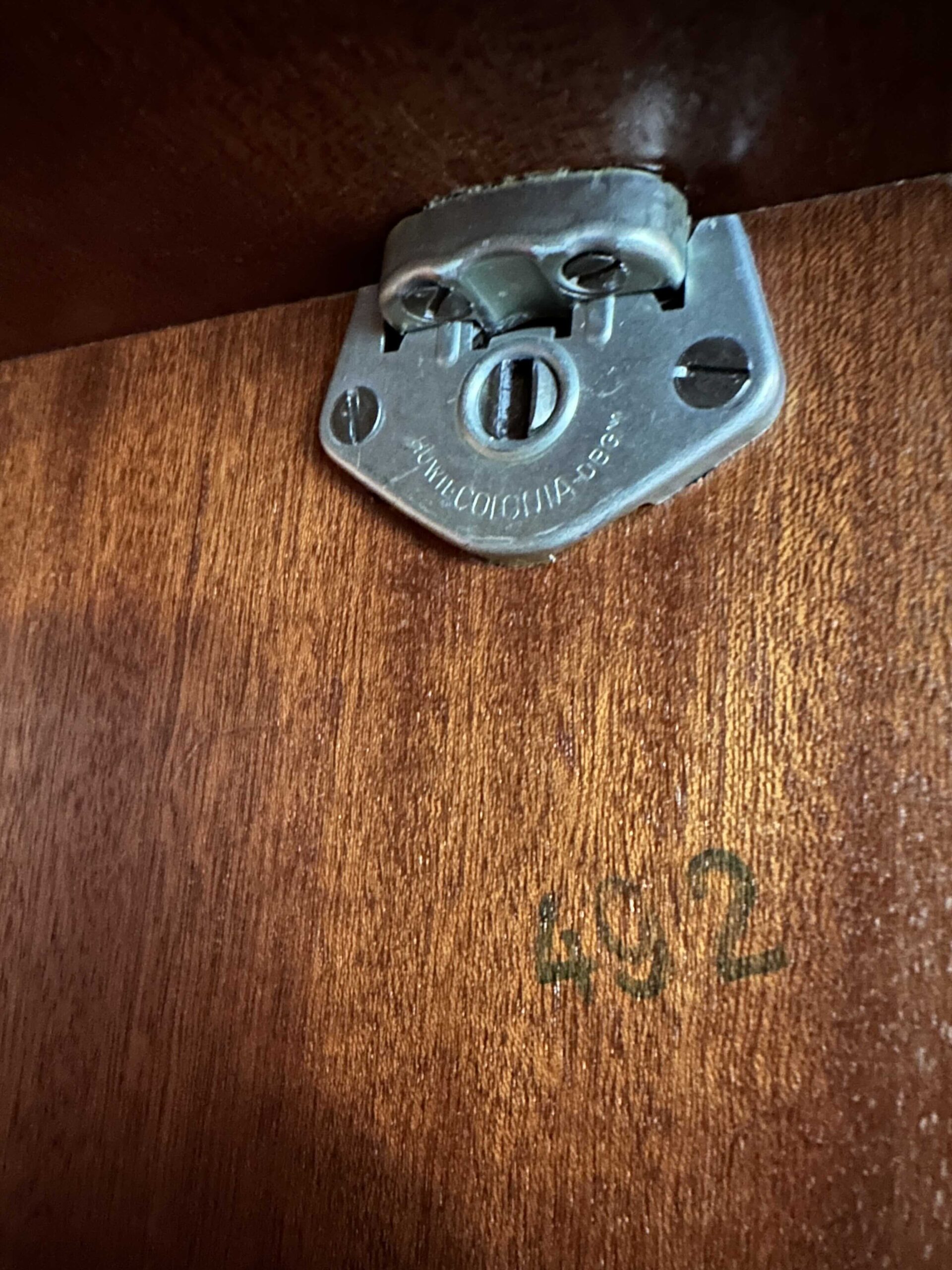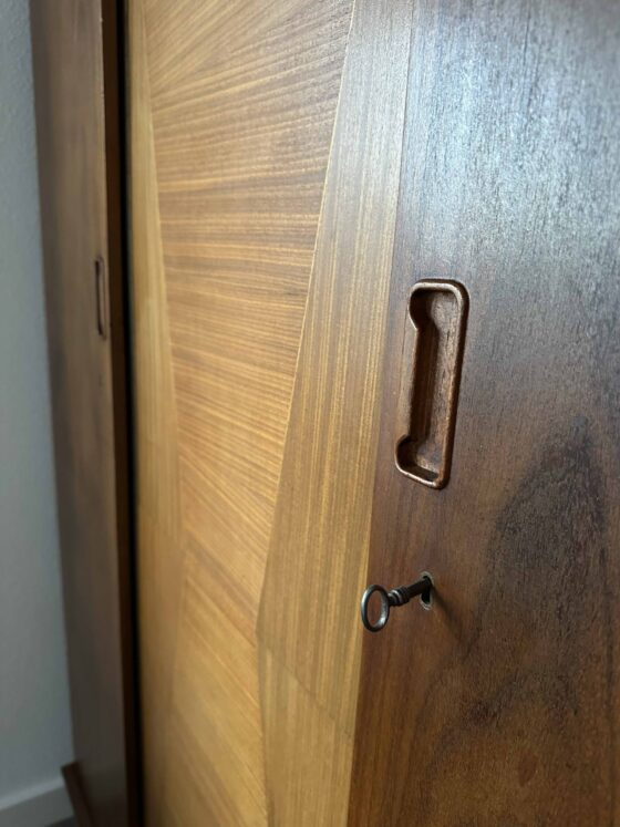Mooie orginele details van die tijd zoals pianoscharnieren, schuif slotjes, slotornamenten en handgrepen. In het middenpaneel een aantal lichte ingelegde stroken wat de kast uniek maakt. De conditie van de kast is goed, heeft lichte gebruiksporen die passen bij de leeftijd.